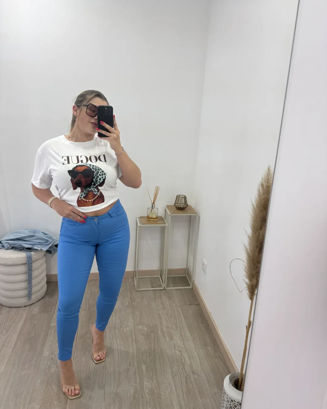 Jeans skinny mega push up, com bastante elastano para uma moldagm perfeita ao corpo. Modelo -5kg.