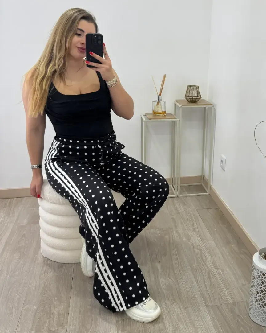Calça estilo fato de treino, inspiração adidas com estampado em bolas mega em alta. Perfeitas para dias descontraídos com estilo ou para look arrojados com um salto. TU, serve S M L.