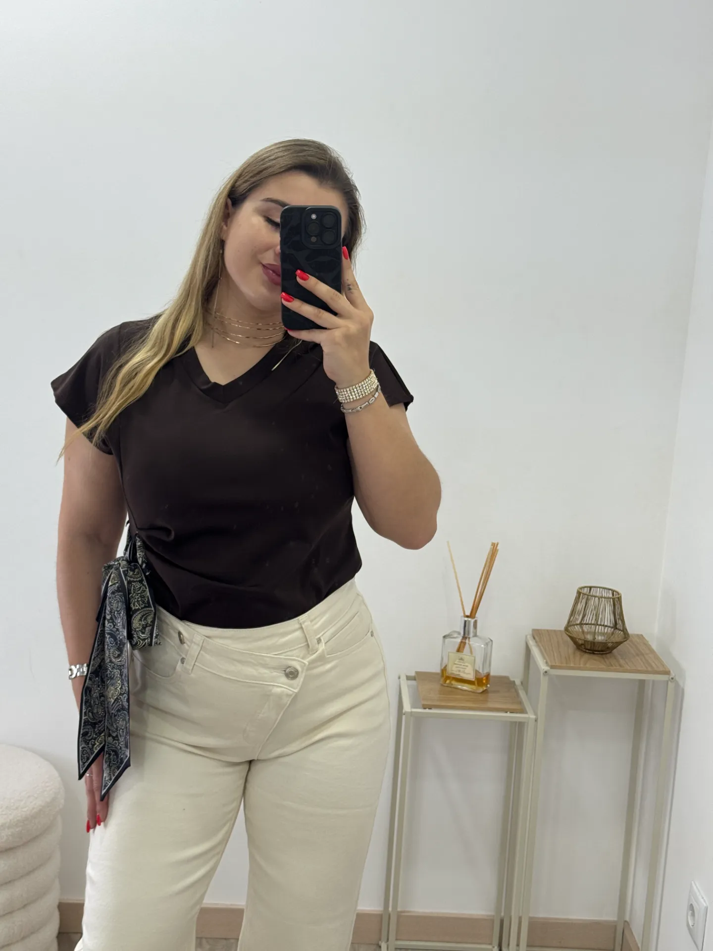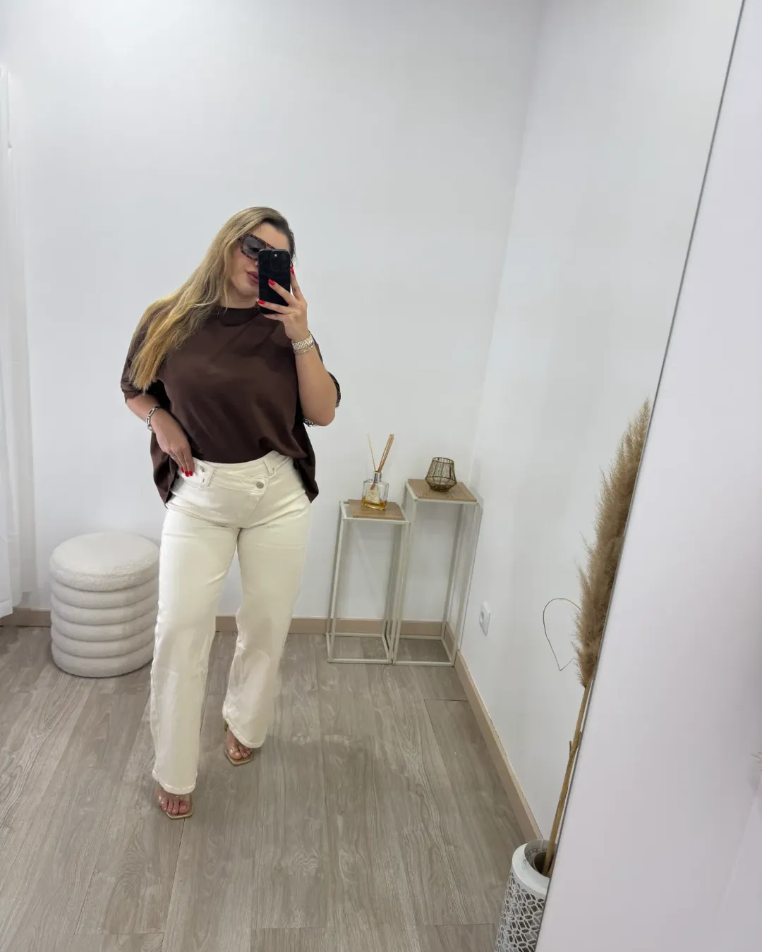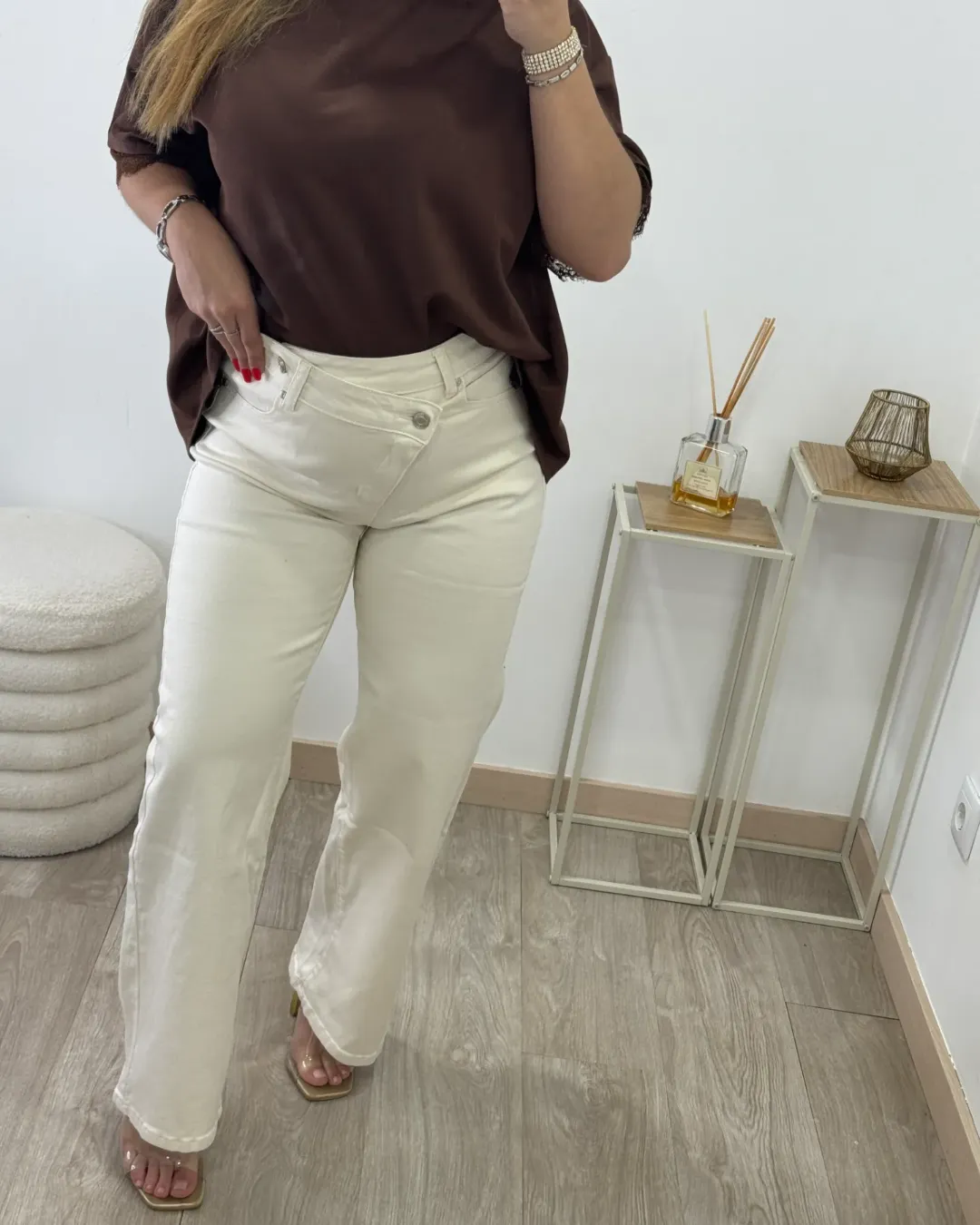 Calça de ganga com bastante elastano, modelo wide leg. Corte perfeito e elegante, calça que modela e realça o corpo, com promenor mega tendência da cintura assimétrica.