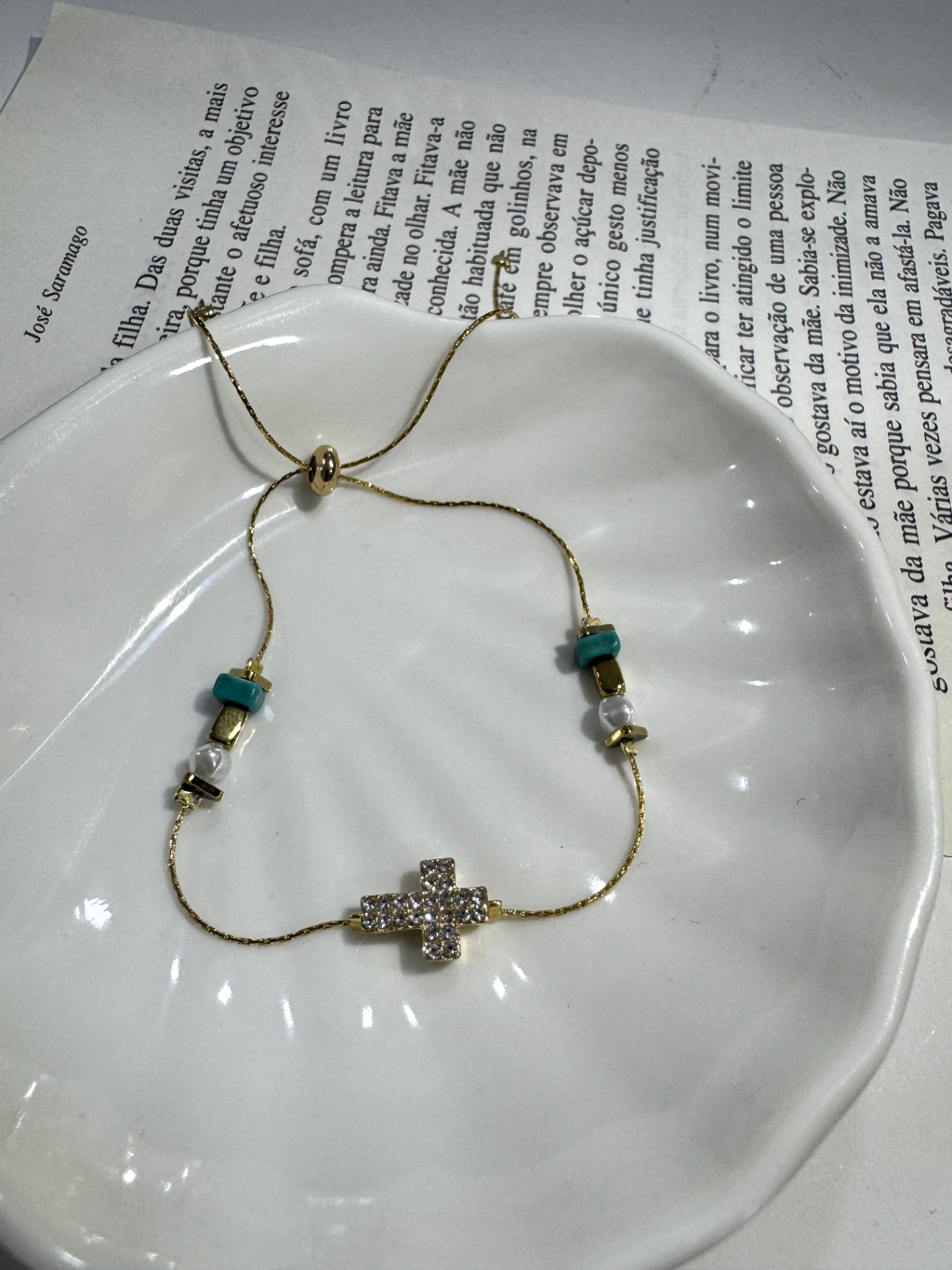 Pulseira em dourado, com cruz em brilhantes e pedras pequenas e delicadas.